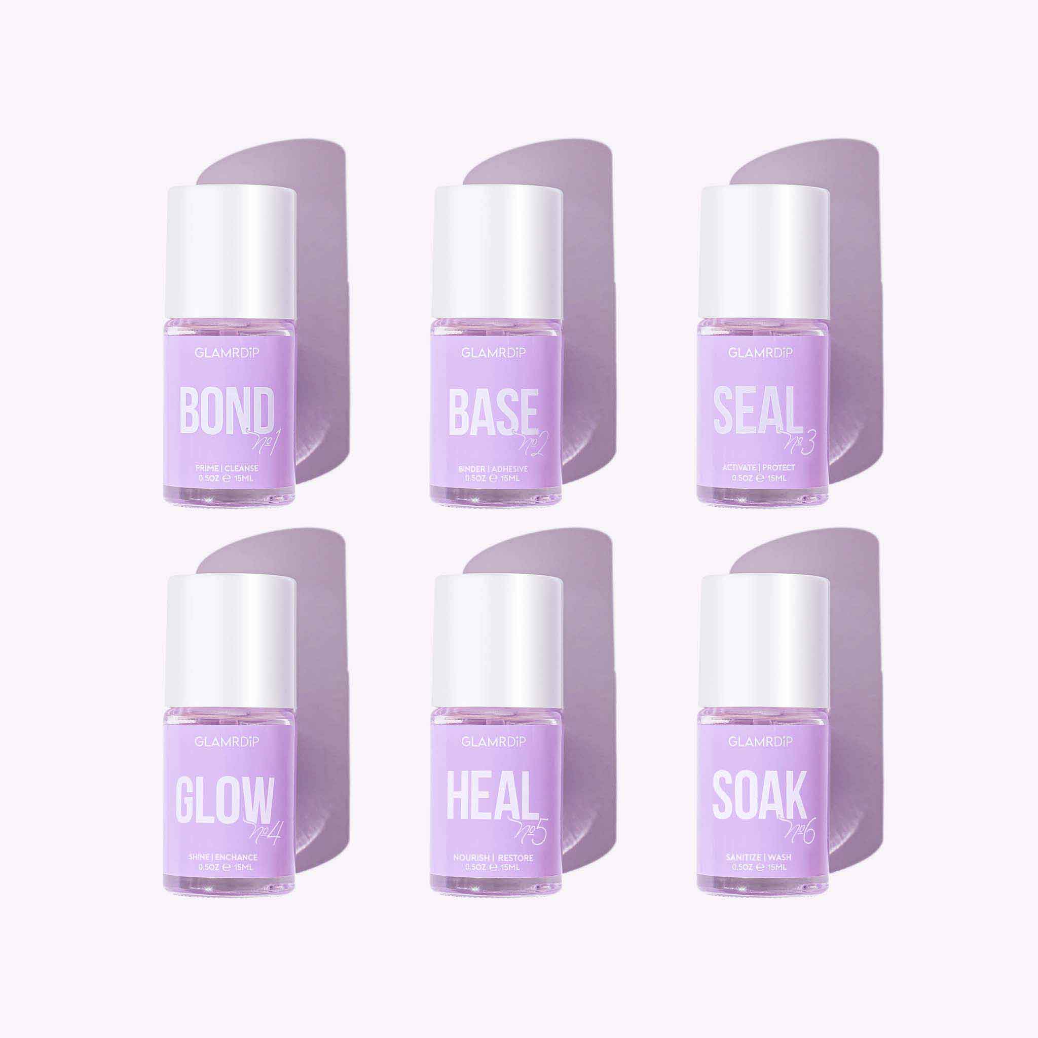 Koko GLAMRDiPin nestevalikoima. Ei tarvetta UV-lampulle! Kaikki nesteet ovat 18-vapaita, eivät sisällä haitallisia aineita ja ovat täynnä luonnollisia kasviuutteita, jotka pitävät kynnet kiiltävinä ja terveinä ympäri vuoden. Tämän nestevalikoiman avulla voit seurata vuoden 2026 kynsitrendejä ja luoda täydellisen manikyyrin kotona. Setti sisältää kaikki tarvittavat nesteet täydelliseen GLAMRDiPin kynsijauhemanikyyriin, mikä tekee levityksestä helppoa ja antaa pitkäkestoisen tuloksen.